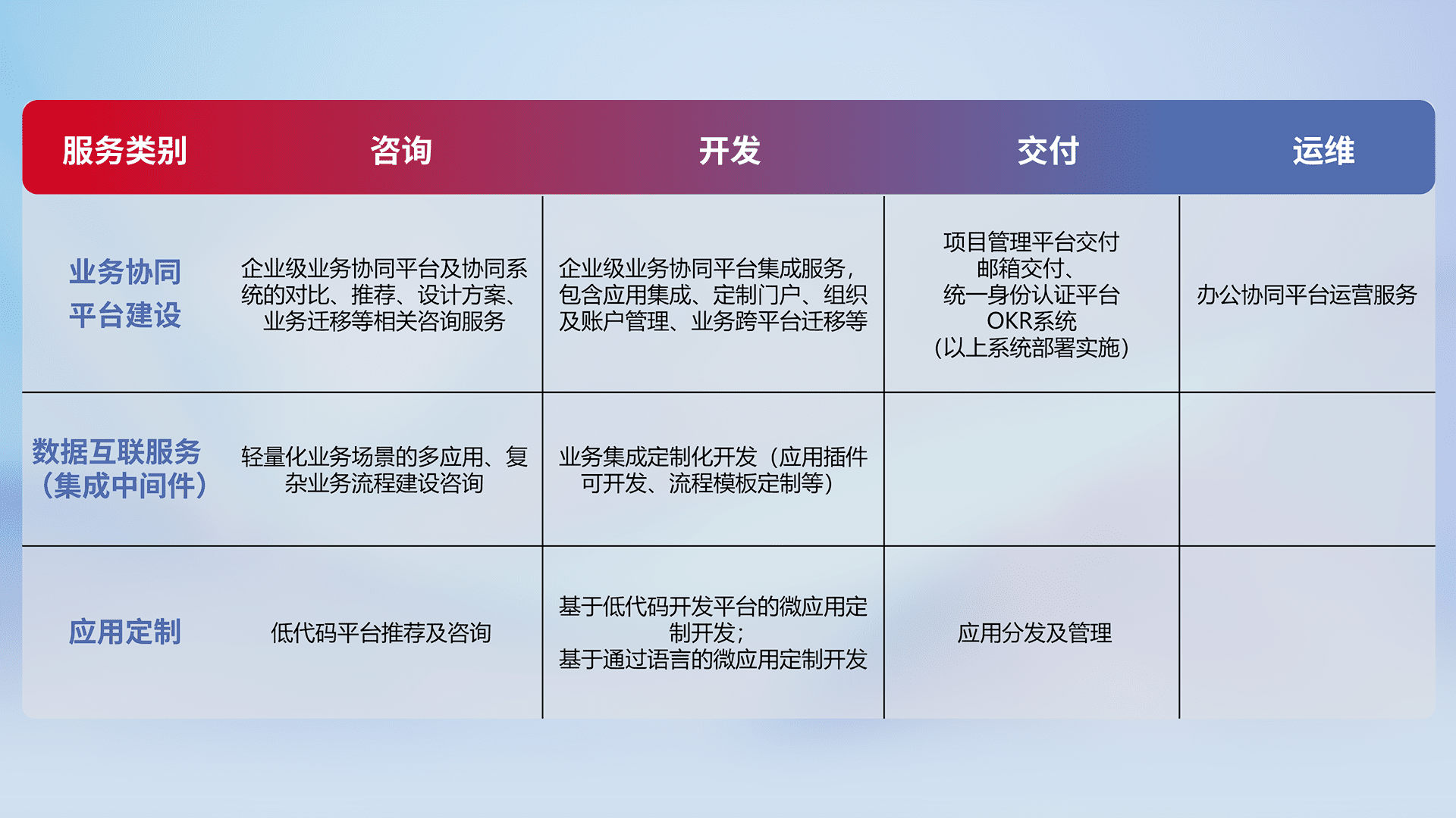 针对钉钉、、企微、、、、IDaas等平台级产品提供产品的规划、、方案、、、交付、、、、定制化开发等服务,,,,实现如统一协同办公、、智能客户服务、、混合会议管理、、、智能数据查询、、、、等业务场景,,实现数字化转型。。。。